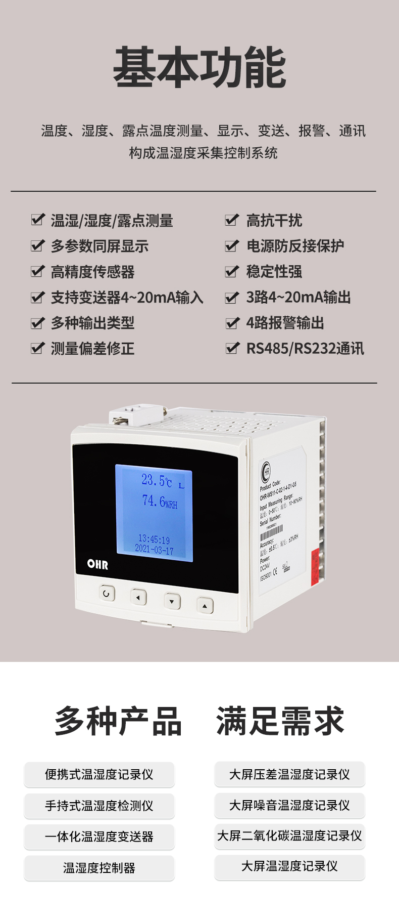 虹潤(rùn)公司是專業(yè)生產(chǎn)環(huán)境監(jiān)測(cè)儀表的國(guó)家專精特新“小巨人”企業(yè)。生產(chǎn)的壁掛式溫濕度控制器,具有溫度、濕度、露點(diǎn)高精準(zhǔn)的測(cè)量,多種輸出類型,穩(wěn)定性強(qiáng),RS485/RS232通訊,IP65防護(hù)等級(jí)等特點(diǎn)。產(chǎn)品獲得一種手持式低功耗溫濕度檢測(cè)儀、大屏幕溫濕度記錄儀等2項(xiàng)國(guó)家發(fā)明專利,主持起草物聯(lián)網(wǎng)智能溫度儀表通用技術(shù)條件、冷鏈溫度記錄儀等2項(xiàng)國(guó)家標(biāo)準(zhǔn),通信系統(tǒng)多通道數(shù)據(jù)采集控制終端規(guī)范軍用標(biāo)準(zhǔn),以及現(xiàn)場(chǎng)設(shè)備集成等5項(xiàng)智能制造國(guó)家標(biāo)準(zhǔn),參與國(guó)際5G標(biāo)準(zhǔn)制定,取得溫濕度儀表等2項(xiàng)相關(guān)軟件著作權(quán)。產(chǎn)品廣泛應(yīng)用于工業(yè)現(xiàn)場(chǎng)、農(nóng)業(yè)大棚、倉(cāng)儲(chǔ)物流、地下管廊、養(yǎng)殖孵化、配電機(jī)房等諸多領(lǐng)域。