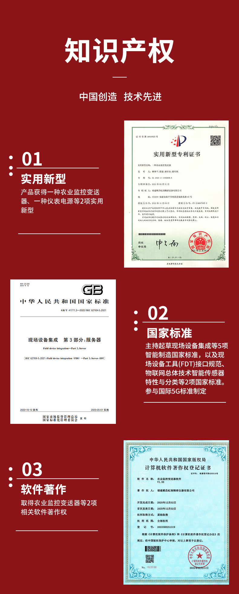 虹潤公司是專業(yè)生產(chǎn)環(huán)境監(jiān)測儀表的國家專精特新“小巨人”企業(yè)。生產(chǎn)的二氧化碳變送器,具有新型紅外檢定技術,自動溫度補償,響應靈敏,低功耗,模擬量變送輸出或RS485通訊等特點。產(chǎn)品獲得一種農業(yè)監(jiān)控變送器、一種儀表電源等2項實用新型專利,主持起草現(xiàn)場設備集成等5項智能制造國家標準,以及現(xiàn)場設備工具(FDT)接口規(guī)范、物聯(lián)網(wǎng)總體技術智能傳感器特性與分類等2項國家標準,參與國際5G標準制定,取得農業(yè)監(jiān)測變送器等3項相關軟件著作權。產(chǎn)品廣泛應用于機房、配電站、地下車庫、工廠倉庫、食品儲存、養(yǎng)殖場、果蔬林園等環(huán)境場合對二氧化碳濃度的檢測。