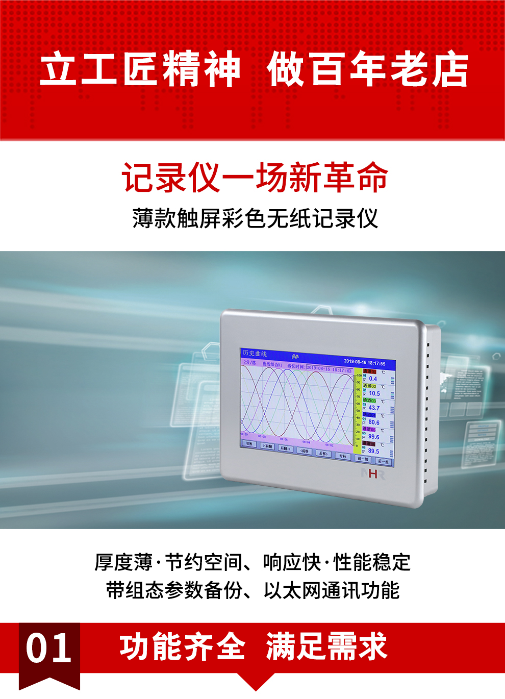 虹潤公司是專業(yè)生產(chǎn)無紙記錄儀的國家專精特新“小巨人”企業(yè)。生產(chǎn)的觸摸屏無紙記錄儀,具有觸摸大屏顯示,多通道全切換輸入,數(shù)據(jù)記錄與轉(zhuǎn)存, RS485/以太網(wǎng)通訊,5/7/9英寸可選等特點。產(chǎn)品獲得一種無紙記錄儀、數(shù)據(jù)采集控制工作站、智能化控制器、巡回檢測顯示方法及裝置等4項國家發(fā)明專利,主持起草物聯(lián)網(wǎng)智能記錄儀表通用技術(shù)條件、物聯(lián)網(wǎng)智能溫度儀表通用技術(shù)條件等2項國家標(biāo)準(zhǔn),通信系統(tǒng)多通道數(shù)據(jù)采集控制終端規(guī)范軍用標(biāo)準(zhǔn),以及空間數(shù)據(jù)與信息數(shù)據(jù)傳輸系統(tǒng)等2項航天標(biāo)準(zhǔn),參與國際5G標(biāo)準(zhǔn)制定,取得觸摸屏彩色無紙記錄儀等4項相關(guān)軟件著作權(quán)。產(chǎn)品廣泛應(yīng)用于冶金、石化、電力、制藥、新能源、現(xiàn)代農(nóng)業(yè)、生產(chǎn)過程等諸多領(lǐng)域。